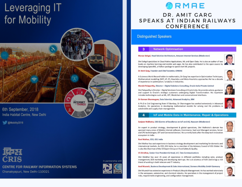 Dr. Amit was invited as a distinguished speaker at the Indian Railways technology conference to speak about the latest trends in network optimisation and how can Indian Railways benefit from some of these advanced Operations Research and Data Science algorithms